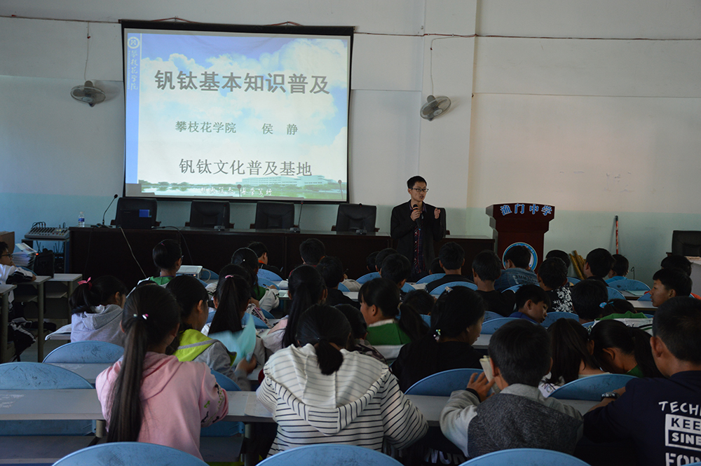 为落实攀枝花市“深入生活、扎根人民”主题实践活动和四川省钒钛文化普及基地建设的要求,让更多普通群众了解钒钛文化,4月7日上午,由宣传部、科研处、科创中心、材料学院、资环学院师生组成的志愿服务队以及四川省钒钛文化普及基地专家到盐边县渔门中学开展以“钒钛文化科普宣传”为主题的 “送科普、种文化”下乡志愿服务活动。