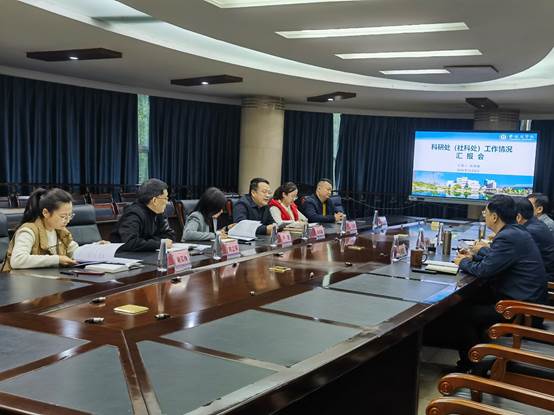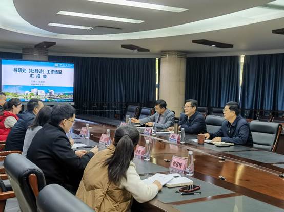 会上,科研处(社科处)负责人就部门情况,学校科研基本情况、科研工作特色、科研工作不足,以及下一步重点工作计划和发展思路等方面进行了汇报。